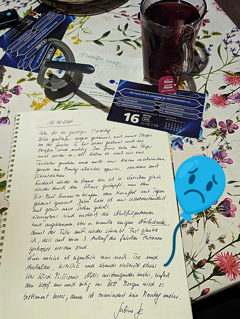 Aber jetzt ist erst mal Freitag, ich habe fertig mit der Woche, oder die Woche ist auch fertig mit mir; so fühlt es sich auch gerade ein wenig an.