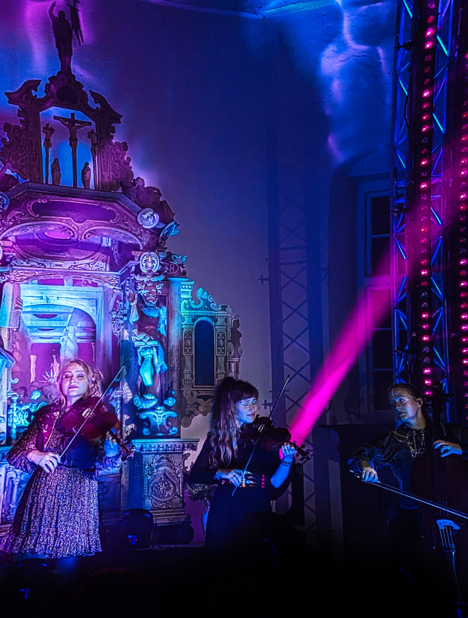 Kannte ich vorher nicht, auch nur einige Sekunden nur vor ein paar Wochen einmal in ein Musikvideo des Quartetts geschaut; ich wollte mich einfach überraschen lassen! Und ich war überrascht, wie sehr ich dieses Konzert genossen habe. Das machte einfach Spaß, auch wenn die Tontechnik nicht perfekt war an manchen Stellen, das brach nicht die Magie und das Flair dieses Abends. Einige ältere Zuhörer/innen verließen zwar gleich zu Beginn der ersten Klänge die ausverkaufte Kirche, aber das war deren Verlust. Vielleicht sind sie mit anderen Vorstellungen gekommen. Und wenn dann auch noch Unholy gespielt wird vor dem Altar, war vielleicht das Fass zu voll. Mir hat es wie gesagt total gut gefallen; es erinnerte mich an Wednsday mit dem Cello, die Musik fand ich ja auch großartig. Einige Stücke habe ich zwar nicht erkennen können (die Musiksuchdienst-App auf dem Handy aber auch nicht); dabei wusste ich, dass ich das Lied ganz sicher kenne. Radiohead, Billy Ilisch, They call me the wild rose und Fallen Leaves … und so viele mehr, Klassik meats Rock und Metal, und machte einfach nur wirklich Spaß!