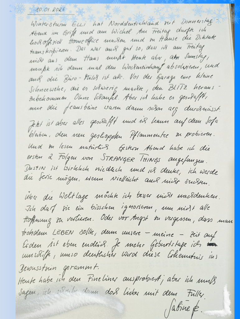 Da bist du ja, 2026. Fast hätte ich den Jahreswechsel verschlafen. Tatsächlich lag ich schon kurz nach 22 Uhr im Bett, hatte eine Ein- und Durchschlafpille geschluckt und um Mitternacht vergessen, dass Silvester war, als ich wegen der Böllerei aus dem ersten Tiefschlaf gerissen wurde und kurz einen Panikanfall hatte. Es ging mir aber auch nicht wirklich gut am letzten Tag von 2025. Mit Kopfschmerzen aufgewacht, leichte Magenschmerzen und generell eher so mau. Ich habe Tee getrunken zu den Berlinern am Nachmittag.