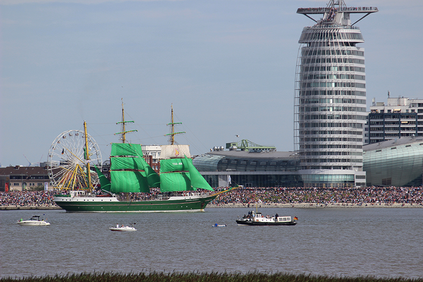 So ein freier (da Überstundenabbau aus dem Nachmittagsbüro) Mitwochnachmittag hat was, und um so mehr, wenn er mit lauter Segelschiffen gefüllt ist, die auf der Weser in den Bremerhavener Hafen schippern. Es ist SAIL-Jahr, und ich wollte dieses Jahr auch schauen. Mit mir schauten Tausende an beiden Seiten der Weser, aber ich fand mein Plätzchen, nachdem ich superpünktlich aus dem Vormittagsbüro entwischen konnte und wie eine Verrückte mit dem Radel nach Blexen gedüst bin. Ich hoffe, ich habe nachher geruchstechnisch niemanden belästigt. LOL