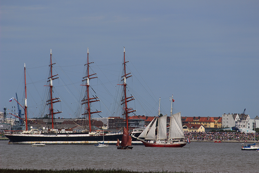 So ein freier (da Überstundenabbau aus dem Nachmittagsbüro) Mitwochnachmittag hat was, und um so mehr, wenn er mit lauter Segelschiffen gefüllt ist, die auf der Weser in den Bremerhavener Hafen schippern. Es ist SAIL-Jahr, und ich wollte dieses Jahr auch schauen. Mit mir schauten Tausende an beiden Seiten der Weser, aber ich fand mein Plätzchen, nachdem ich superpünktlich aus dem Vormittagsbüro entwischen konnte und wie eine Verrückte mit dem Radel nach Blexen gedüst bin. Ich hoffe, ich habe nachher geruchstechnisch niemanden belästigt. LOL
